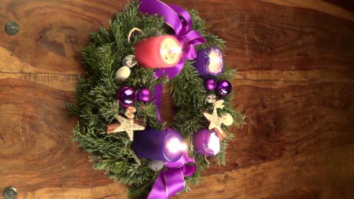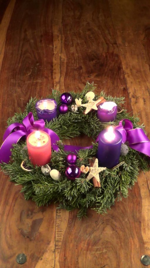 Advent wreath (here on a wooden table), part of the christian pre-christmas time. The candles count the four sundays before christmas day. Upright Size.