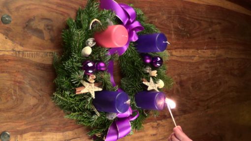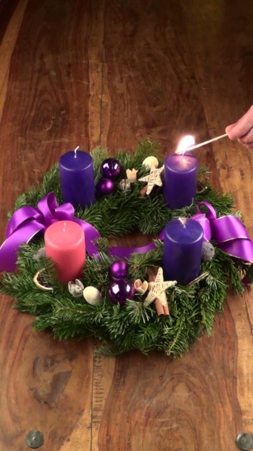 Advent wreath (here on a wooden table), part of the christian pre-christmas time. The candles count the four sundays before christmas day. Upright Size.