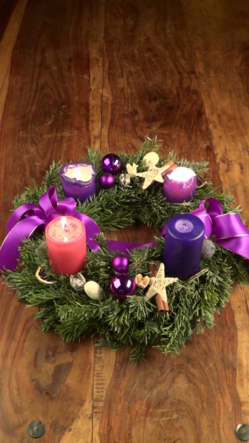 Advent wreath (here on a wooden table), part of the christian pre-christmas time. The candles count the four sundays before christmas day. The one different-coloured candle stands for the third sunday “Gaudete”. Upright Size.