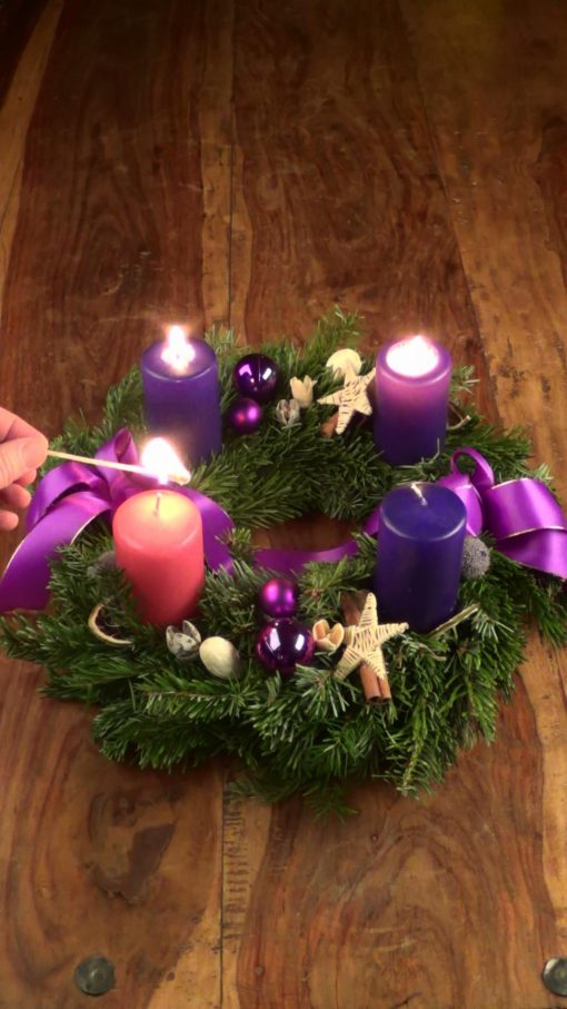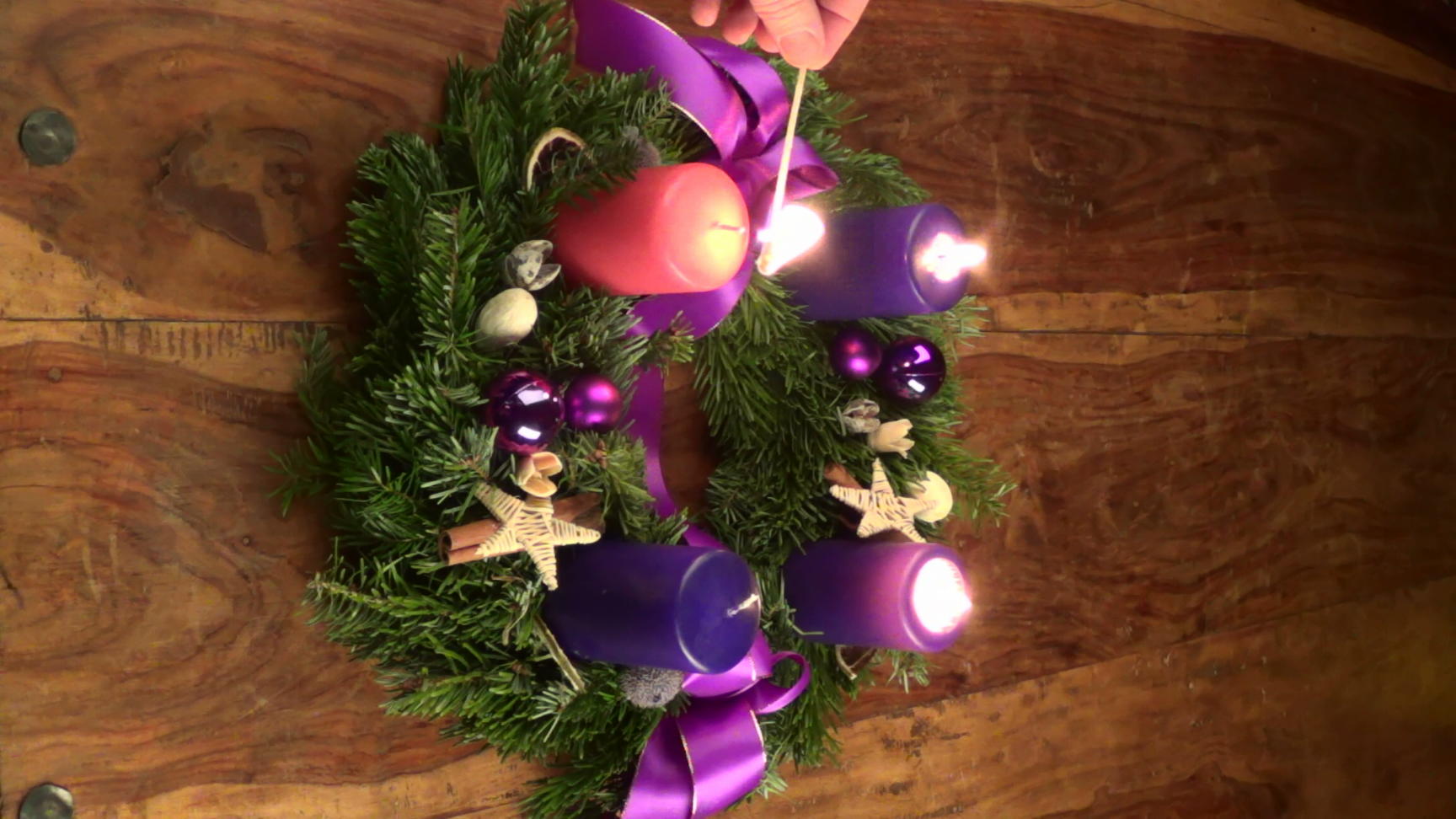Advent wreath, part of the christian pre-christmas time. Two candles are on. A hand lights the third candle.