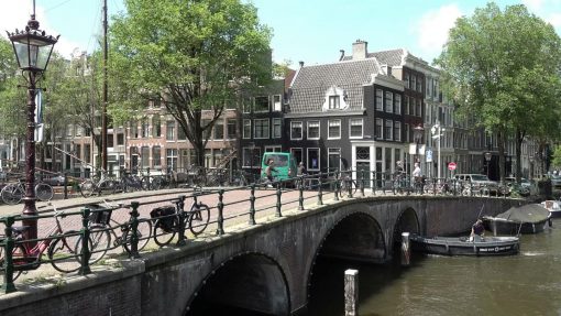 Everyday life at the corner of Brouwersgracht and Keizersgracht. The old town of Amsterdam (within Singelgracht) is UNESCO World Cultural Heritage Site. This is a panorama from the right to the left.