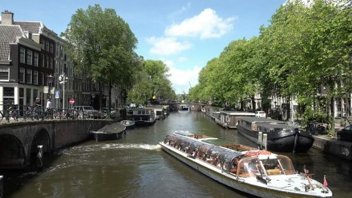 Boat at the corner of Brouwersgracht and Keizersgracht. The old town of Amsterdam (within Singelgracht) is UNESCO World Cultural Heritage Site. This is a panorama from the left to the right.