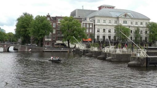 Amstel, Magere Brug and Theater Carre, seen from the Frans Hendriksz Oetgensbrug. The old town of Amsterdam (within Singelgracht) is UNESCO World Cultural Heritage Site. This is a panorama from the left to the right.
