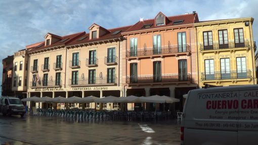 Plaza Espana with the beautiful town hall. This is a panorama from the left to the right. Astorga is a city on the Camino de Santiago (St. James Trail), which is UNESCO World Cultural Heritage Site.
