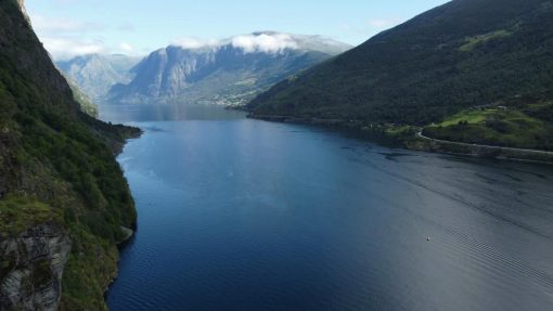 The Aurlandsfjord near Flåm. The village Aurland in the distance. This is a flight forward. UNESCO World Natural Heritage Site.
