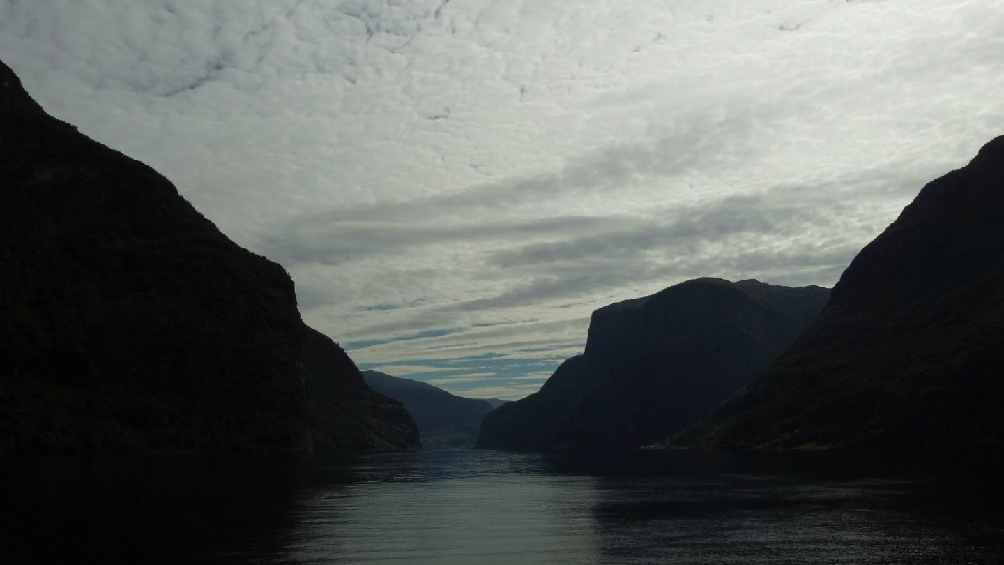 Аурландсфьорд, Норвегия. Вид с катера. Деревня Ундредал появляется вдалеке с правой стороны. Части Аурландс-фьорда внесены в список Всемирного природного наследия ЮНЕСКО.