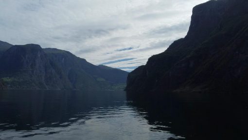 View from the motorboat. The village Undredal is on the right hand side, we see the village Aurland in the distance. This part of Aurlandsfjord is UNESCO World Natural Heritage.