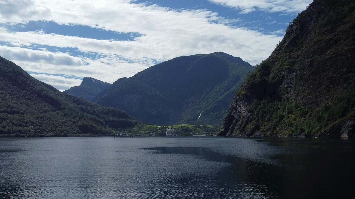 ノルウェー、アウルランドフィヨルド。アウルランドフィヨルドの終点にある村、フロムへ向かう船。ユネスコの世界自然遺産。