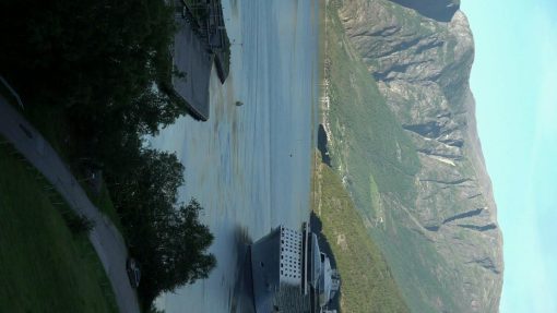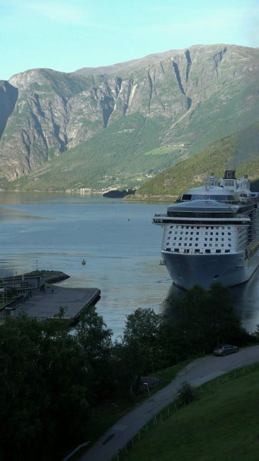 A cruise ship starts to leave the port of Flåm. The video speed is accelerated, the trailer video is even more accelerated. This part of Aurlandsfjord is UNESCO World Natural Heritage Site.