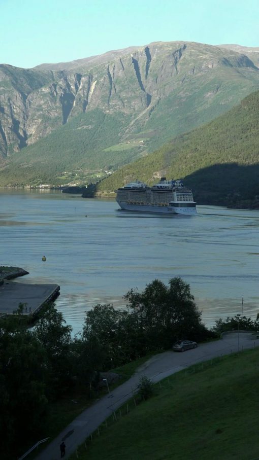 A cruise ship leaves the port of Flåm. The video speed is accelerated, the trailer video is even more accelerated. This part of Aurlandsfjord is UNESCO World Natural Heritage Site.
