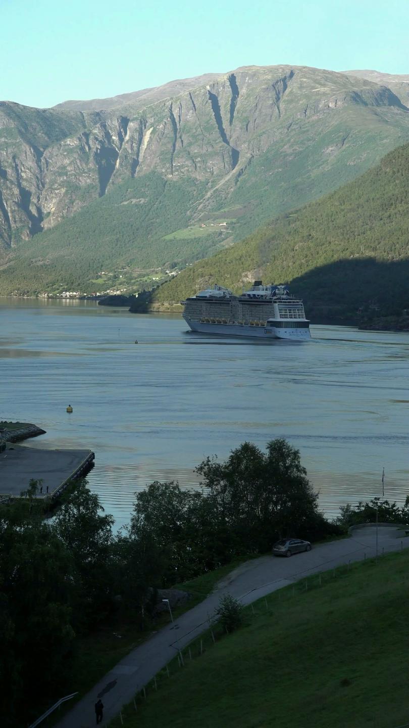 Аурландсфіорд, Норвегія. Круїзний лайнер виходить з порту Флом. Швидкість відео прискорена. Сонячний літній вечір. Ця частина Аурландсфіорду внесена до списку Всесвітньої природної спадщини ЮНЕСКО. Вертикальний розмір.