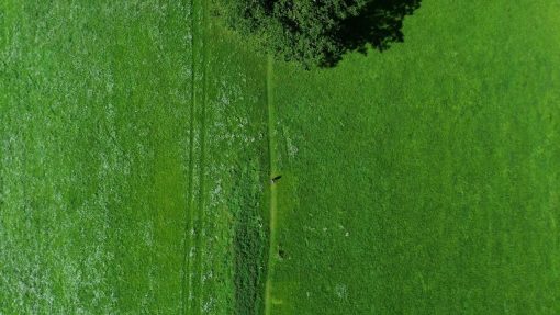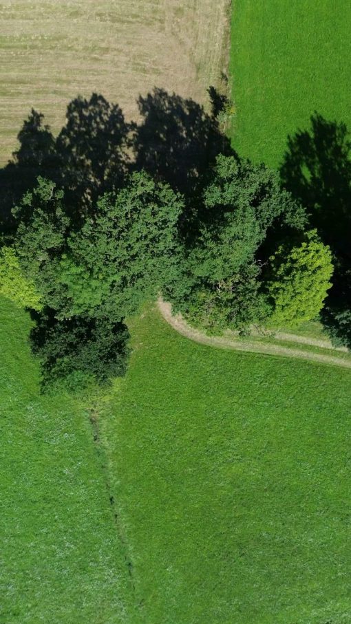 Meadows and trees, seen from above. The landscape passes from left to right.