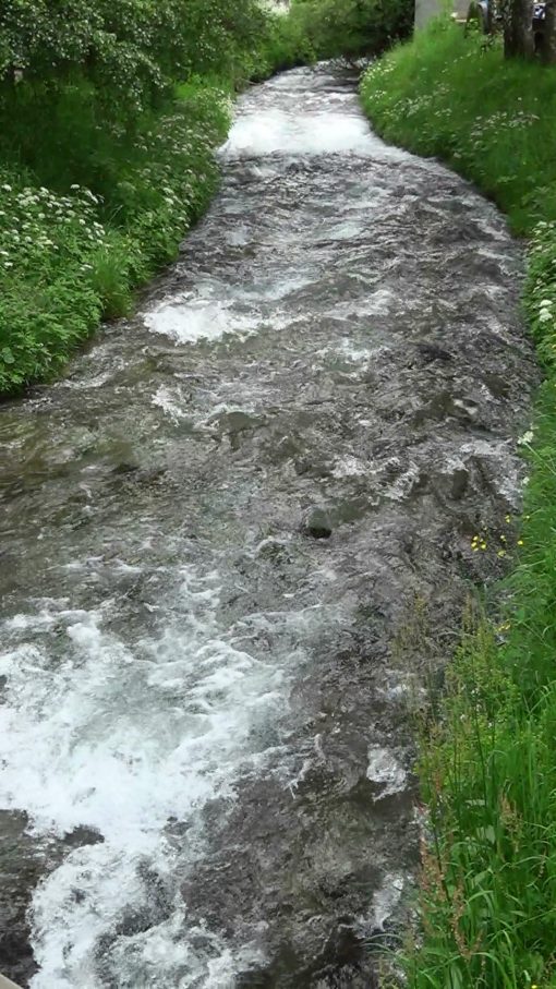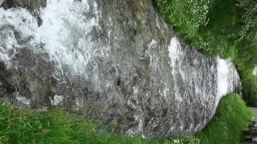 Austria, Europe. A mountain brook in Zankwarn, a village deep in the Austrian Alps. Water flow leaves the camera position. Upright Size.