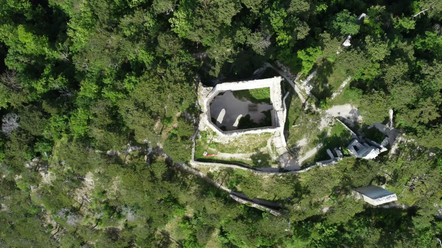 Castle ruin in the forest. The ruin passes from the left to the right.