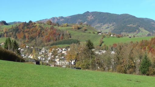 Schwarzach im Pongau, a town in the Austrian Alps, south of the city of Salzburg. Indian Summer. Panorama from the right to the left.