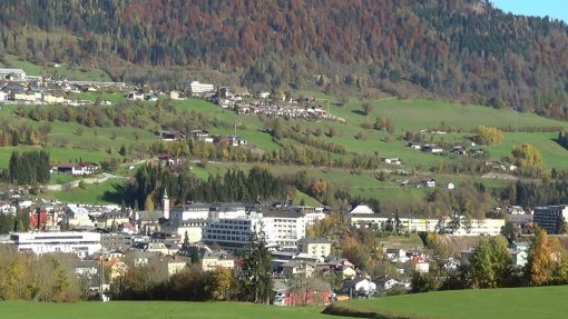 Schwarzach im Pongau, a town in the Austrian mountains, south of the city of Salzburg. This is a panorama from the right to the left.