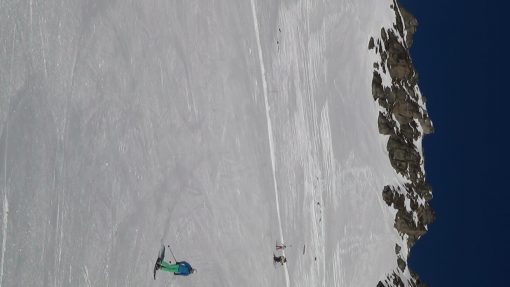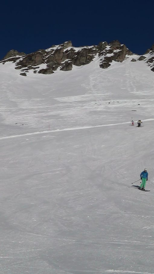 Skiing in the mountains of Salzburger Land. Few people in the first half of this video. This is a panorama from the left to the right. Upright Size.