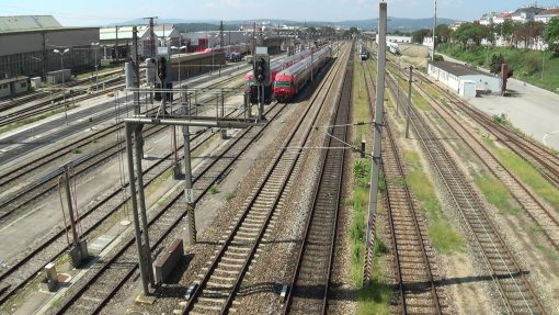 Austria, Europe. Train and tracks, seen from above. The train is leaving the camera position. This is a tilt up.
