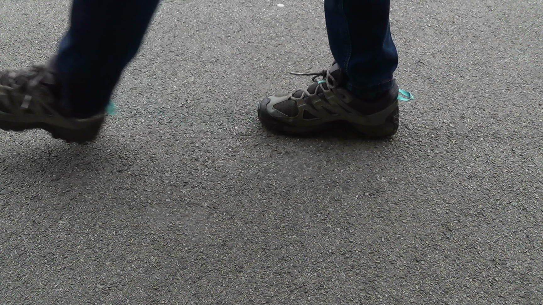 Walking feet on an urban sidewalk. Shoes compilation. The feet walk from the right to the left.
