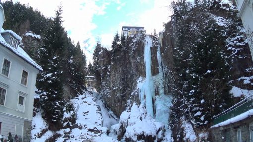 The waterfall of “Gasteiner Ache” in the center of town, seen from the bridge. Slow tilt up.