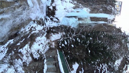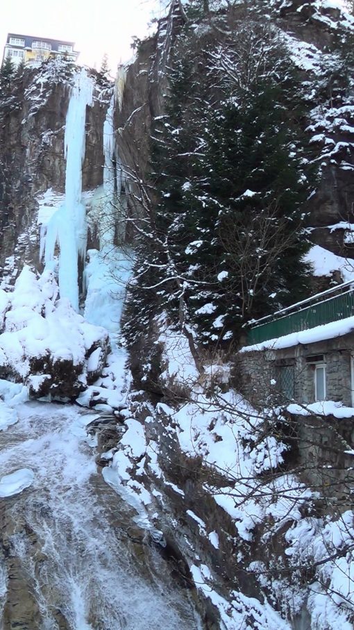 The waterfall of “Gasteiner Ache” in the center of town, seen from the bridge. This is a panorama from the left to the right. Upright Size.