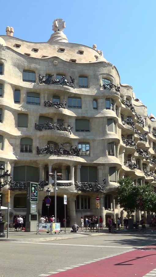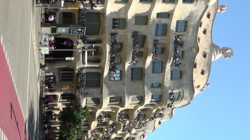 The house of the Mila Family on Passeig de Gracia, a work of the artist Antonio Gaudi y Cornet. UNESCO World Cultural Heritage Site. This is a panorama from the left to the right.