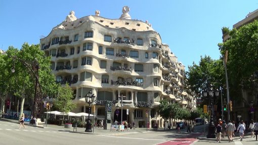 The house of the Mila Family on Passeig de Gracia, a work of the artist Antonio Gaudi y Cornet. UNESCO World Cultural Heritage. This is a panorama from the left to the right.