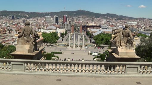 A view from Palau Nacional down to the city, to Placa de Espana and Avenida Reina Maria Cristina. The waters of Font Magica de Montjuic are off that day. This is a panorama from the left to the right.