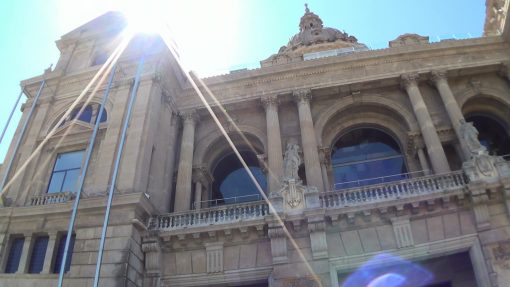 The main front of Palau Nacional, a panorama from the right to the left. Back light, sunbeams from over the roof.