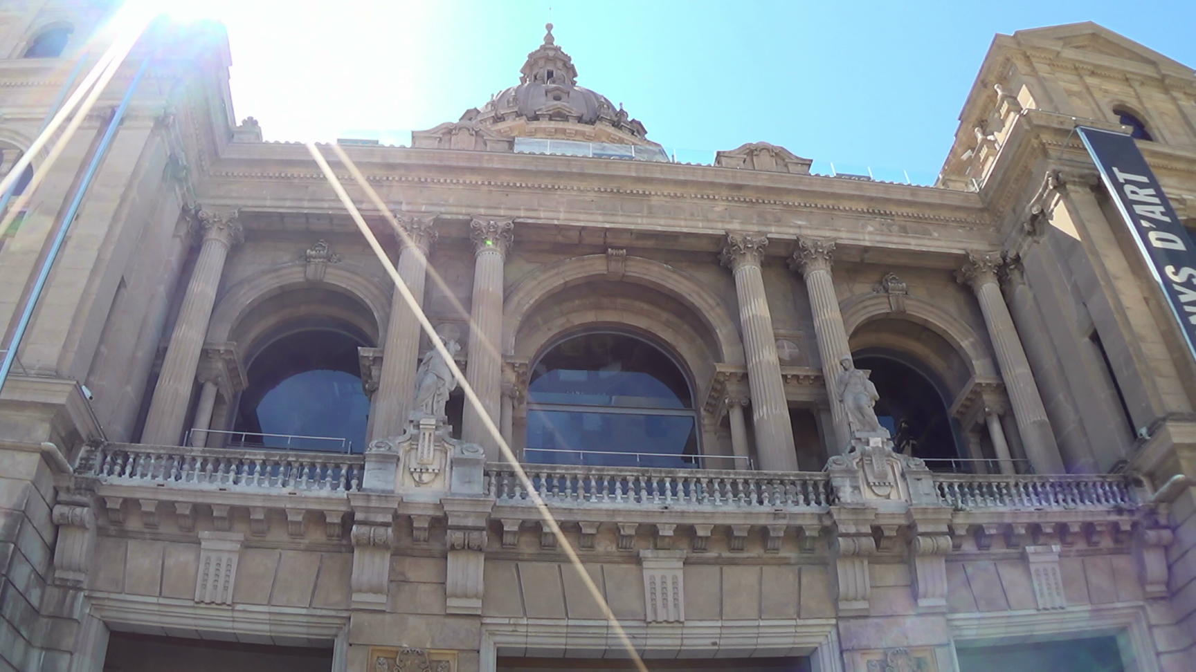 The main front of Palau Nacional, a panorama from the left to the right. Back light, sunbeams from over the roof.