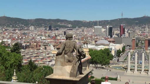 A view from Palau Nacional down to the city, to Placa de Espana and Avenida Reina Maria Cristina. The waters of Font Magica de Montjuic are off that day. This is a panorama from the right to the left.