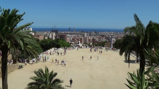 Barcelona and the mediterranean sea, seen over the terrace of Parque Güell, created by the spanish artist and architect Antoni Gaudi y Cornet. UNESCO World Cultural Heritage Site.