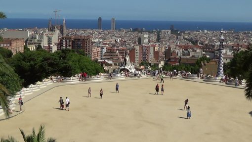 View to town and to the mediterranean sea from Parque Güell, created by the spanish artist and architect Antoni Gaudi y Cornet. UNESCO World Cultural Heritage Site. This take is closer to the object than the take no. 53055, here with more terrace and less sky.