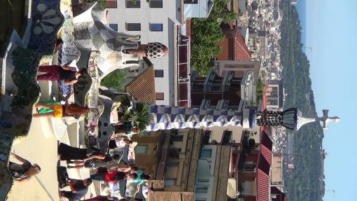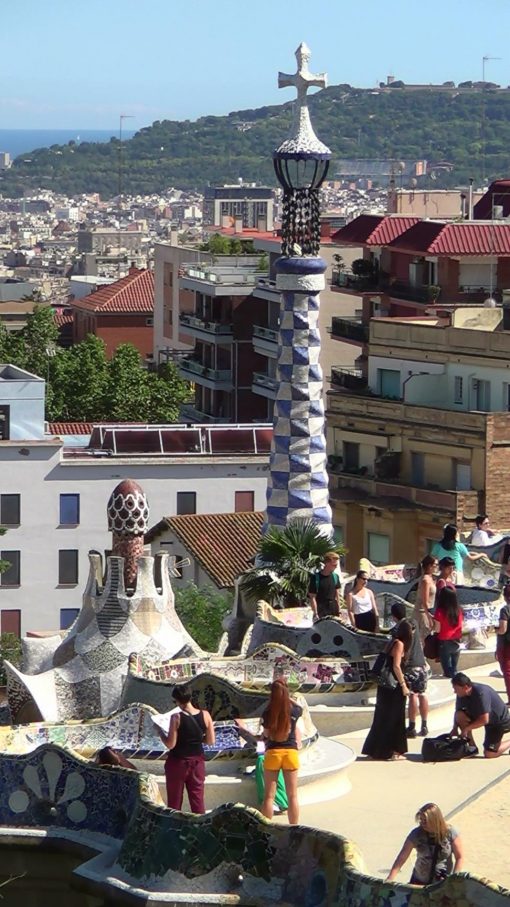 A view to town over the terrace of Parc Güell, created by Antonio Gaudi y Cornet. UNESCO World Cultural Heritage Site.