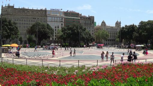 Morning on Placa de Catalunya. The camera position is right between the two fountains.