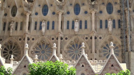 The Templo Expliatorio de la Sagrada Familia, the most complex work of Antonio Gaudi y Cornet. UNESCO World Cultural Heritage Site. This is a panorama at the “Passion Facade”, from the left to the right.
