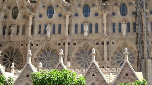 The Templo Expliatorio de la Sagrada Familia, the most complex work of Antonio Gaudi y Cornet. UNESCO World Cultural Heritage Site. This is a panorama over nave and towers at the “Passion Facade”, from the right to the left.