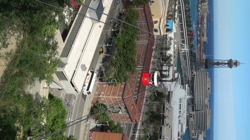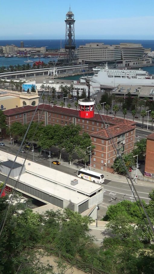 Transbordador Aeri is a ropeway service that connects Montjuic (mountain) and Barceloneta (beach). This is the view from Montjuic. The red gondola is on the way to Montjuic. Upright Size.