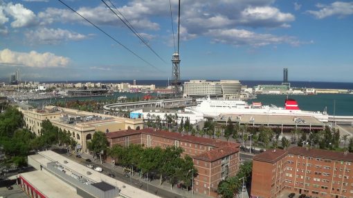 Transbordador Aeri is a ropeway service that connects Montjuic (mountain) and Barceloneta (beach). This is the view from the gondola, right after the departure on Montjuic.Port Vell in the distance.