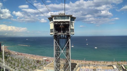 Transbordador Aeri is a ropeway service that connects Montjuic (mountain) and Barceloneta (beach). The cabin on the way to Barceloneta approaches the tower Sant Sebastia.