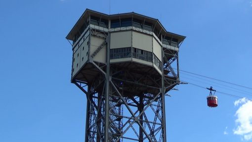 Transbordador Aeri is a ropeway service that connects Montjuic (mountain) and  Barceloneta (beach). The cabin on the way to Barceloneta approaches the tower Sant Sebastia.