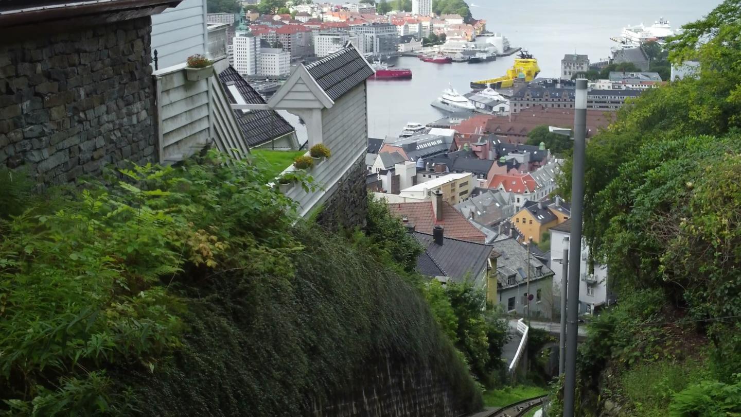 View from Mount Fløien. The funicular Fløibanen is on the way up. The old town of Bergen is UNESCO World Cultural Heritage Site.