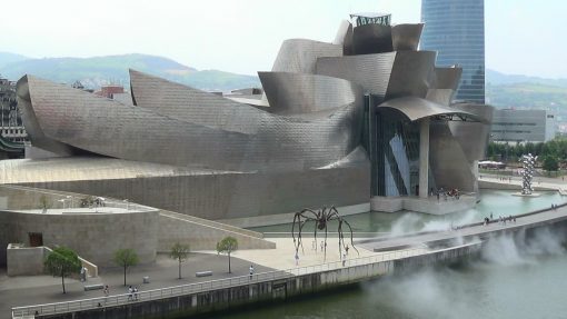 The spider “Maman” (Artist: Louise Bourgeois) and the Guggenheim Museum (Architect: Frank Gehry), seen from across the Nervion River. Mind the smoke clouds from the generators under the boardwalk.
