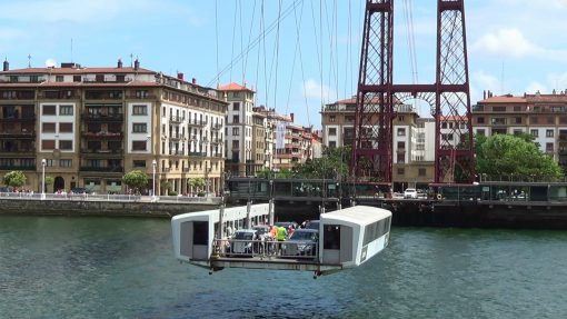 Puente de Vizcaya, known as Puente Colgante. UNESCO World Cultural Heritage. This is a panorama from the left to the right, the gondola is on the way from Getxo to Portugalete, seen from Portugalete.