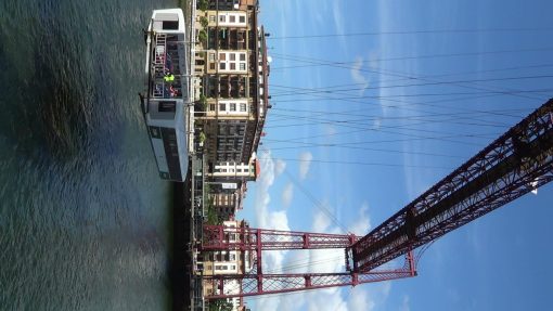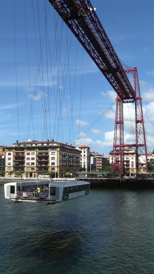 Puente de Vizcaya, known as Puente Colgante. UNESCO World Cultural Heritage Site. The gondola is on the way from Getxo to Portugalete, seen from Portugalete.