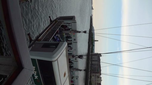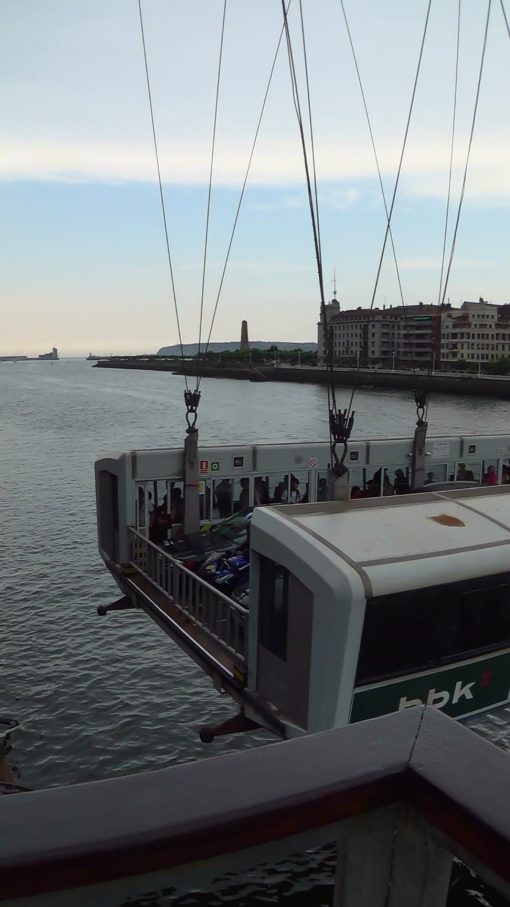 Puente de Vizcaya, known as Puente Colgante. UNESCO World Cultural Heritage Site. Creators: Alberto Palacio Elissague, Ferdinand Arnodin. The gondola is on the way from Getxo to Portugalete, seen from Portugalete. This is a panorama from the right to the left.