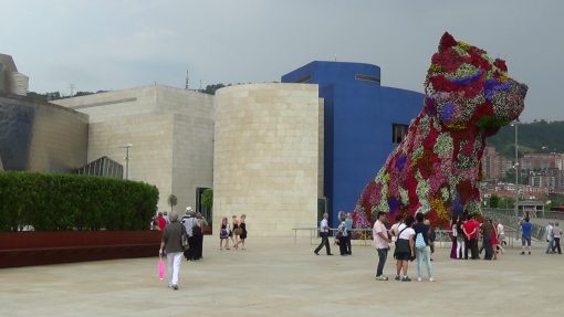 The flower dog “Puppy” (Artist Jeff Koons) on the square in front of the Guggenheim Museum. Dark clouds, rain ahead.