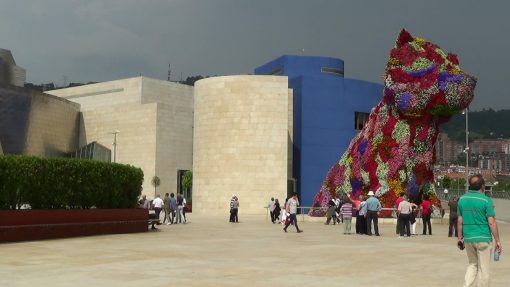 The flower dog “Puppy” on the square in front of the Guggenheim Museum. Dark clouds, rain ahead.