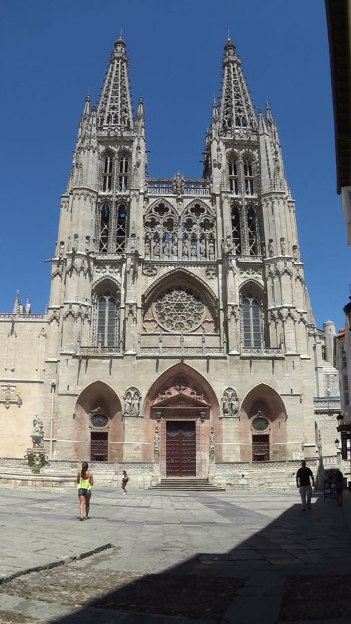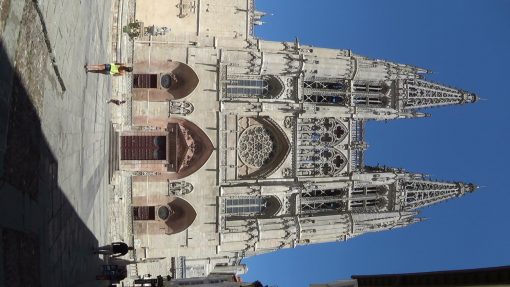 The western facade of the Catedral de Santa Maria de Burgos, seen over Plaza Santa Maria. This is a panorama from the right to the left. The cathedral is UNESCO World Cultural Heritage Site.
