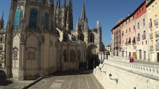 The Catedral de Santa Maria de Burgos, seen from Calle de Fernan Gonzalez. UNESCO World Cultural Heritage Site. Morning life. The Albergue Municipal for pilgrims of the Camino de Santiago (St. James Trail) is right behind the camera.